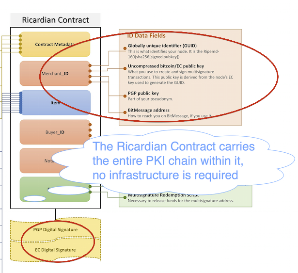 Ricardian contracts stand out as an internally-complete solution to authorisation and authentication using cryptography, but they do not depend or use in any form the classical PKI ideas or Certification Authorities. The reasons for this are severalfold: